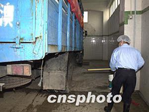 圖為裝載著禽類產(chǎn)品的運(yùn)輸車輛在進(jìn)入澳門南粵批發(fā)市場后,工作人員為車輛進(jìn)行消毒。