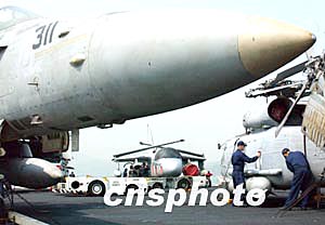 據(jù)資料顯示,小鷹號于一九六一年四月二十九日下水服役,是一艘常規(guī)動力航空母艦,排水量八萬一千一百二十三噸,長三百二十五米,可搭載七十架戰(zhàn)機及五千五百名水兵、海軍航空隊人員和海軍陸戰(zhàn)隊。上得艦來,看見很多飛機停在甲板上,身穿藍色制服的地勤人員不停地走來走去,對飛機進行各種檢修。