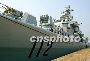 參加中法三月十六日在青島某海域軍事演習(xí)的解放軍112驅(qū)逐艦,十四日嚴(yán)陣以待。中新社記者:宋吉河