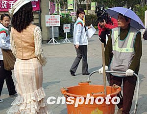 日前,在香港維多利亞公園一位頭戴別致遮陽(yáng)帽的環(huán)保員工,與身穿華麗服飾的港姐迎面而過(guò),兩人不同的服飾顯得各具風(fēng)采。作者:錢興強(qiáng)