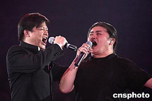 “歡歌2004演唱會”在座無虛席的首都體育館隆重上演,中國內(nèi)地歌手劉歡(右)與特邀嘉賓香港歌手莫華倫一起為到場歌迷獻(xiàn)上了眾多耳熟能詳?shù)母枨。作?高遠(yuǎn)