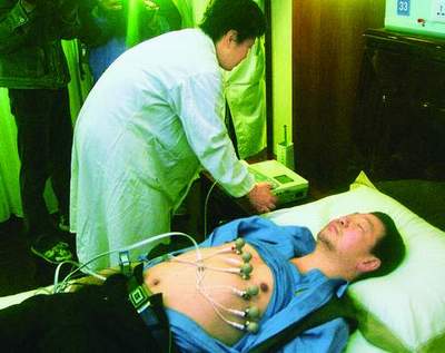 昨日,是“東方超人”陳建民正式挑戰(zhàn)饑餓極限49天的日子。記者(注:成都日?qǐng)?bào)記者)早早來到陳建民挑戰(zhàn)地點(diǎn)碧峰峽景區(qū),而英國(guó)天空電視臺(tái)、中央電視臺(tái)、新華社等國(guó)內(nèi)外媒體也早已全副武裝。剛進(jìn)碧峰峽,只見專程為陳建民表演而量身定做的16平方米的八角玻璃房已架在四根14米高柱子上,整個(gè)玻璃房懸在半空,以便所有人都能仔細(xì)看到他在房里的一舉一動(dòng)。