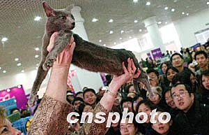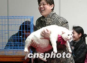 2004年3月21日是世界名貓盛會(huì)亮相上海最后一天,當(dāng)天舉行了許多單體項(xiàng)目的比賽,近120多只來(lái)自中國(guó)各地的名貓角逐“中國(guó)貓王”,最終新一屆的“貓王”頭銜被一只金吉拉摘走。中新社傳真 楊磊攝
