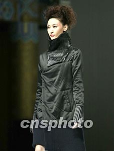 主題為“性情暢流、城市輪廓、快樂狂想”的2004—2005年波斯登秋冬防寒服流行趨勢發(fā)布會(huì),三月三十日在北京國際時(shí)裝周閃亮登場。圖為世界小姐季軍獲得者關(guān)琦身著一襲黑色防寒服出場亮相。中新社記者:毛建軍