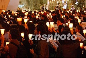 四月一日,是一代歌星張國榮逝世一周年忌日,眾多香港及海外歌迷來到文華酒店前,手舉燭光杯懷念歌星張國榮。中新社記者:錢興強