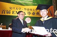 由復(fù)旦大學(xué)和華盛頓大學(xué)合作的復(fù)旦——華盛頓首屆EMBA學(xué)員畢業(yè)典禮四月三日晚在上海舉行,這是中國國內(nèi)高校首屆EMBA畢業(yè)典禮。作者:湯彥俊