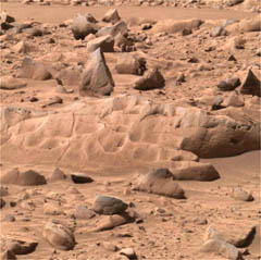 勇氣號今年1月3日登陸火星Gusev環(huán)形山,科學家認為這里曾經(jīng)是一個湖泊,F(xiàn)在,勇氣號正在向著一個丘陵區(qū)挺進,在那兒,可能會有證明火星曾是一個濕潤星球的地質(zhì)證據(jù),包括一些由液態(tài)水沖刷而形成的沉積巖。