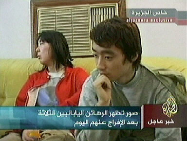 據(jù)報(bào)道,被釋放的3名人質(zhì),目前在伊拉克穆斯林長(zhǎng)老會(huì)的保護(hù)下健康狀態(tài)良好。該電視臺(tái)播放了3名人質(zhì)的圖像。被釋放的3名人質(zhì)分別為自由撰稿人今井紀(jì)明(18歲,札幌市西區(qū))攝影記者郡山總一郎(32歲,東京都杉并區(qū))和志愿社會(huì)活動(dòng)家高遠(yuǎn)菜穗子(34歲、北海道千歲市)。