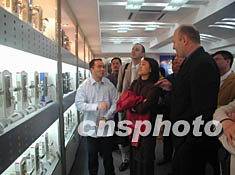 由法國巴黎圣但尼省維爾塔內(nèi)市市長雅克·布萊爾先生等七人組成的“法國市長代表團”日前在溫州市甌海區(qū)考察其民營經(jīng)濟,并尋求雙方經(jīng)貿(mào)合作機會。圖為代表團參觀中國十大鎖王之一的“天宇鎖業(yè)”。作者:林丹