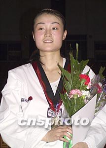 二○○四年全國跆拳道錦標賽暨奧運會資格選撥賽四月二十一日晚在海南?隗w育館舉行五十九公斤級決賽,曾獲得世界冠軍的解放軍隊選手王朔,獲得五十九公斤級冠軍,并獲得雅典奧運會參賽資格。作者:王辛莉