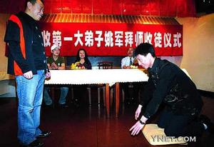 正式的拜師儀式簡(jiǎn)短、熱烈,擲地有聲的三叩首表達(dá)了徒弟歸于師父門下的誠(chéng)意,隨后,師徒二人互贈(zèng)紀(jì)念品,徒弟將金畫《雄鷹展翅》贈(zèng)予師父,而師父則將自己的小品專輯以及電視劇《正月里來(lái)是新春》的光碟回贈(zèng)給徒弟,目的是希望他今后堅(jiān)持演文明戲,演有尊嚴(yán)、有人格的作品,做一個(gè)德藝雙馨的藝人。