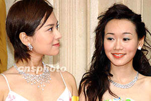 香港影視紅星郭羨妮[左]、楊思琦,4月24日珠光寶氣盛裝出席“3D-GOLD”名表展覽廳開幕典禮。作者:洪少葵