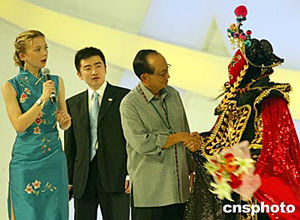 四月二十四日晚,博鰲亞洲論壇上演精彩的“亞洲文化”晚會(huì),論壇理事長(zhǎng)拉莫斯向中國(guó)“變臉”藝術(shù)家表示欽佩。中新社記者:鄭萍萍