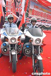 《中華人民共和國道路交通安全法》五月一日正式實施。四月二十五日,十余萬北京民眾走上街頭宣傳這一法規(guī)。威武的警員成為龐大宣傳隊伍中最為吸引人目光的焦點。中新社記者:任海霞