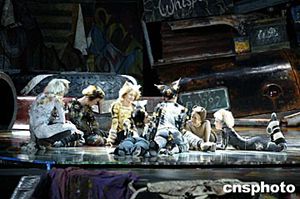將于四月二十七日在北京人民大會堂大禮堂隆重上演的著名音樂劇《貓》,舞臺已經(jīng)搭建完成,二十五日演員正在緊張排練。中新社記者:毛建軍