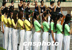 四月二十九日,在重慶參加首屆中國西部模特大賽的女選手排隊拍照,男模特在一旁欣賞美女姿容。中新社記者:任晨鳴