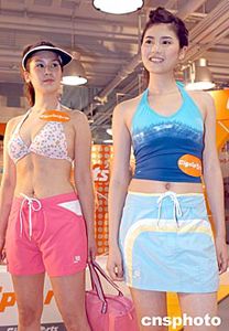 樂壇新星官恩娜(右)、歌星陳見飛5月12日在香港出席全港最大的運(yùn)動(dòng)專門店GigaSports SuperStore開幕,兩人客串模特展示最新泳裝。