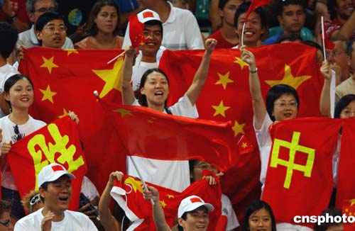 當(dāng)?shù)貢r間8月19日,在中國選手張寧與荷蘭選手之間進(jìn)行了女子羽毛球單打比賽的決賽,圖為場外觀眾為中國隊(duì)吶喊助威。