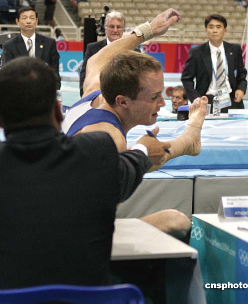 圖為奧運(yùn)會(huì)男子體操全能比賽中,美國(guó)選手保羅-漢姆在跳馬項(xiàng)目中出現(xiàn)失誤,摔倒在一名裁判腿上。不過,最后他還是拿到了這個(gè)項(xiàng)目的冠軍。