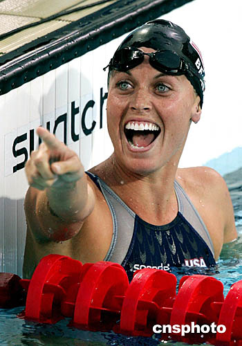 在當?shù)貢r間8月19日舉行的女子200米蛙泳比賽中美國選手阿曼達-比爾德勇奪金牌。圖為她在得知自己奪冠后歡呼的鏡頭。