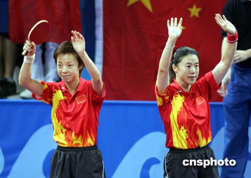 中新社雅典八月二十日電 (記者 宋方燦)千呼萬(wàn)喚之后,中國(guó)乒乓球今天終于出現(xiàn)在雅典奧運(yùn)會(huì)決賽場(chǎng)上。在眾多前來(lái)助威的中國(guó)球迷的助威聲中,王楠和張怡寧不負(fù)眾望,以四比零擊敗韓國(guó)選手李恩實(shí)/石恩美,奪取了中國(guó)乒乓球隊(duì)本屆比賽的第一枚金牌。