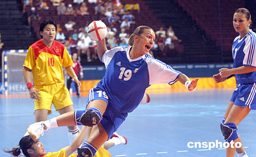 在當(dāng)?shù)貢r間8月19日舉行的女子手球比賽中,中國隊以34比13戰(zhàn)勝東道主希臘隊,挺進四強。圖為希臘選手在比賽中射門時的一個鏡頭。