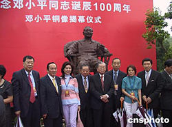 來(lái)自五大洲三十一個(gè)國(guó)家的百余名海外華僑華人,今天上午在雨中參觀“小平故里”紀(jì)念園。在新近揭幕的鄧小平銅像前,僑領(lǐng)們興致勃勃,或打著傘或淋著雨,紛紛與面帶微笑、坐在藤椅上的小平銅像合影。
