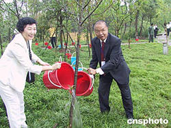 今天上午,“華僑林”留芳碑揭彩儀式后,僑領(lǐng)們紛紛提起水桶為一棵棵木澆水。圖為一對(duì)僑領(lǐng)夫婦在澆水。