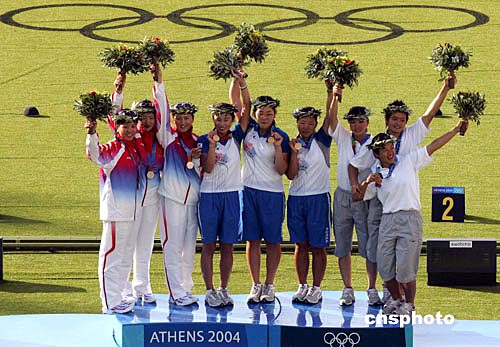中新社雅典八月二十日電 雅典當(dāng)?shù)貢r(shí)間今天傍晚,中國女箭手在奧運(yùn)會(huì)團(tuán)體決賽中,以二百四十比二百四十一而一箭惜敗,再度負(fù)于上屆奧運(yùn)冠軍韓國隊(duì),獲得銀牌。中國臺(tái)北隊(duì)奪取銅牌。