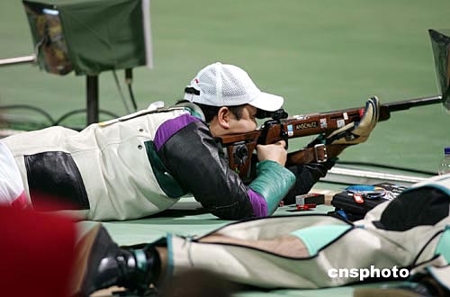 當(dāng)?shù)貢r(shí)間八月二十日,中國選手賈占波在雅典奧運(yùn)男子步槍五十米臥射比賽中獲得第八,這是中國在該項(xiàng)目上取得的奧運(yùn)會(huì)最好成績。中新社記者:毛建軍