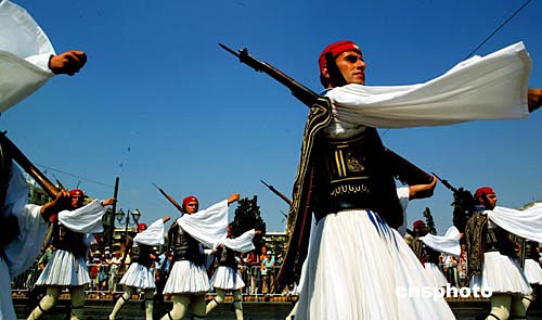 在雅典無名戰(zhàn)士紀(jì)念碑前站崗的希臘王家衛(wèi)隊衛(wèi)兵,身著當(dāng)年爭取民族獨立戰(zhàn)爭時期山區(qū)戰(zhàn)士的裝束。成為一名王家衛(wèi)隊衛(wèi)兵是很多希臘青年的夢想。中新社記者:王瑤