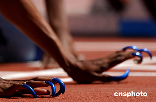 美國(guó)“女飛人”蓋爾-德弗斯第五次出征奧運(yùn)會(huì),她曾在25屆和26屆奧運(yùn)會(huì)上連續(xù)贏得100米短跑金牌。圖為她的那個(gè)起跑前獨(dú)一無(wú)二的預(yù)備動(dòng)作——用手背貼地而彎起長(zhǎng)長(zhǎng)的美麗指甲。