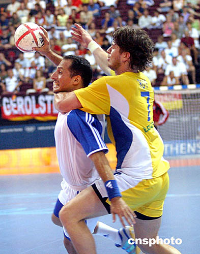 圖為在當(dāng)?shù)貢r(shí)間8月20日舉行的男子手球比賽中,巴西隊(duì)與希臘隊(duì)比賽的場(chǎng)面。最后巴西隊(duì)22比26不敵希臘隊(duì)。