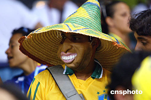 圖為在當(dāng)?shù)貢r(shí)間8月20日舉行的希臘隊(duì)與巴西隊(duì)的排球比賽中,一個(gè)球迷帶著古怪的面具為自己球隊(duì)加油。