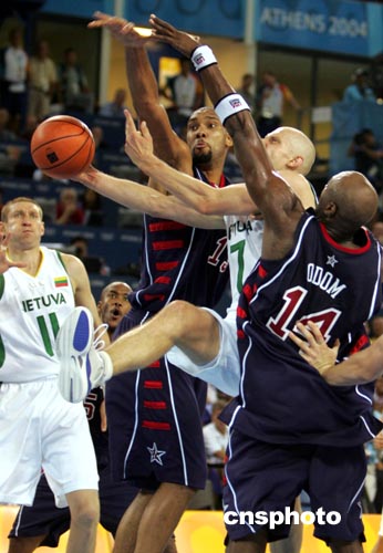 中新社雅典八月二十一日電 繼雅典奧運(yùn)首場(chǎng)小組賽被波多黎各擊潰后,美國(guó)夢(mèng)六隊(duì)今天再度落敗。立陶宛憑借其神準(zhǔn)的三分球以九十四比九十戰(zhàn)勝美國(guó)隊(duì),這也使美國(guó)男籃遭遇到其奧運(yùn)史上的第四場(chǎng)失利。