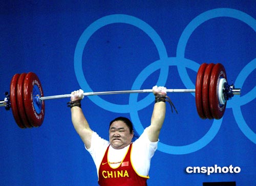 當(dāng)?shù)貢r(shí)間8月21日,中國選手唐功紅在雅典奧運(yùn)女子75公斤以上級(jí)舉重比賽中,打破挺舉和總成績兩項(xiàng)世界紀(jì)錄,奪得該項(xiàng)目的金牌。中新社記者:王瑤