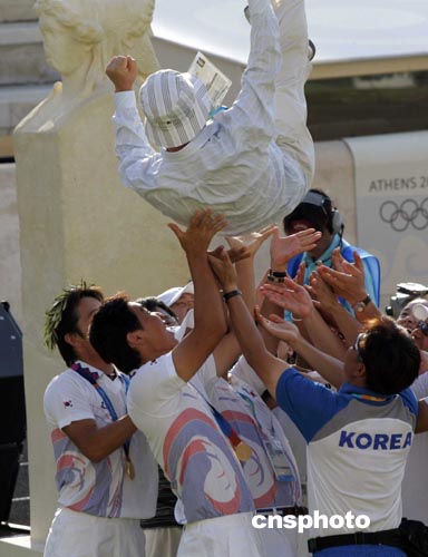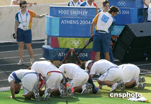 當(dāng)?shù)貢r(shí)間8月21日下午,在雅典奧運(yùn)會(huì)男子射箭團(tuán)體決賽中,韓國(guó)男子射箭隊(duì)?wèi){借強(qiáng)勁實(shí)力奪得金牌。中新社記者:張煒