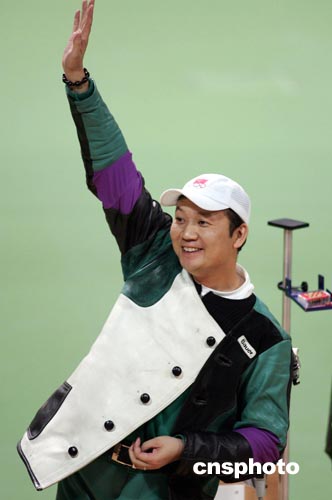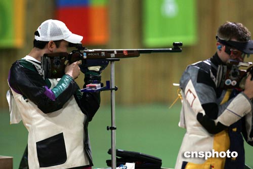 當(dāng)?shù)貢r(shí)間八月二十二日下午,在雅典奧運(yùn)會男子三乘四十射擊比賽中,中國的賈占波以一千二百六十四點(diǎn)五環(huán)的成績獲得金牌。中新社記者:毛建軍