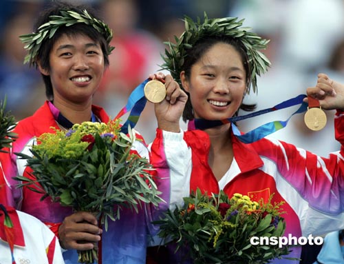 中新社雅典八月二十二日電 不鳴則已,一鳴驚人!中國姑娘李婷/孫甜甜在今天雅典奧運(yùn)網(wǎng)球女雙決賽中,以令人信服的實(shí)力,直落兩局擊潰西班牙組合馬丁內(nèi)斯/帕斯奎爾,勇奪奧運(yùn)網(wǎng)球女雙金牌。