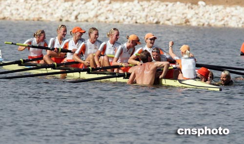 當(dāng)?shù)貢r間八月二十二日,在雅典奧運(yùn)賽艇賽場觀看比賽的幾名男性觀眾跳入水中賽道,狂吻參賽選手。中新社記者:毛建軍