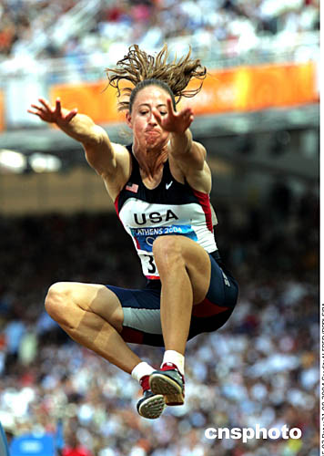 圖為在當(dāng)?shù)貢r(shí)間8月21日舉行的女子七項(xiàng)全能跳遠(yuǎn)項(xiàng)目比賽中,蒂法內(nèi)-洛特-霍甘(Tiffany Lott-Hogan)的出色表現(xiàn)。