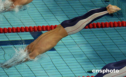 圖為美國(guó)天才游泳選手菲爾普斯在男子200米蝶泳比賽中入水的鏡頭。