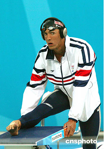 圖為獲得男子100米蝶泳冠軍的美國選手菲爾普斯(Michael Phelps)在做賽前準(zhǔn)備活動(dòng)。