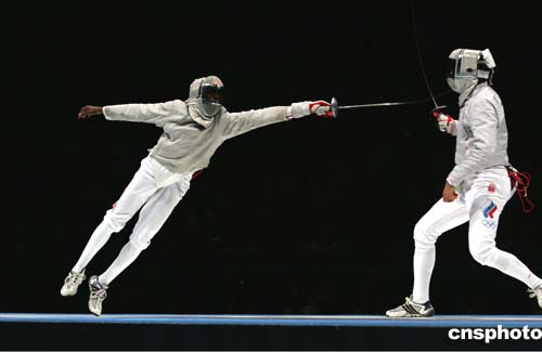 當(dāng)?shù)貢r間8月19日,美國選手Ivan Lee與俄羅斯選手Serguei Charikov在男子佩劍團(tuán)體三、四名決賽中的爭奪。