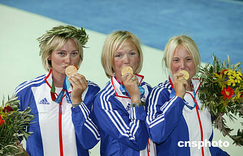 圖為英國運(yùn)動員本·安斯利(Ben Ainslie)和英國選手arah Webb, skipper Shirley Robertson,Sarah Ayton在奪得帆船芬蘭人級比賽和三人女子龍骨船-鷹鈴級帆船比賽冠軍后親吻金牌的場面。
