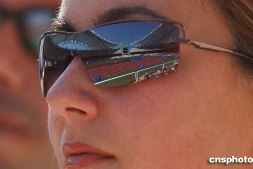 墨鏡中映射出的是雅典奧林匹克運(yùn)動(dòng)場(chǎng)田徑賽區(qū)。