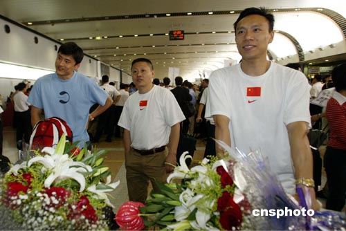 8月23日,在雅典奧運(yùn)會與金牌失之交臂的中國男子花劍著名三劍客葉沖、董兆致和王海濱回到北京,在首都國際機(jī)場受到人們的熱烈歡迎。中新社記者:盛佳鵬