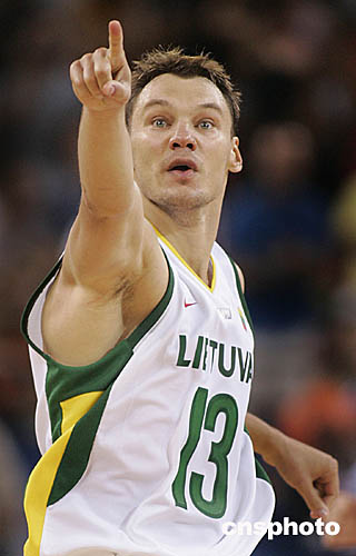 圖為立陶宛隊(duì)員賈斯科維奇烏斯(Sarunas Jasikevicius)在投入三分球后指向他的球迷的鏡頭。