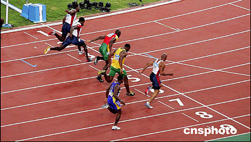 圖為在當(dāng)?shù)貢r(shí)間8月22日舉行的男子100米“飛人”大戰(zhàn)中,選手們最后沖刺的鏡頭。