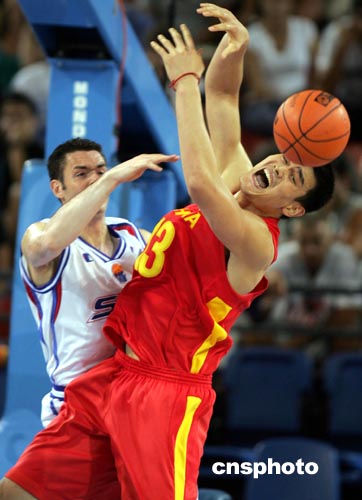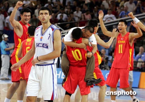 當?shù)貢r間八月二十三日下午,中國男籃在雅典奧運會小組賽最后一場比賽中以67:66一分險勝塞黑隊,闖入前八名,姚明打滿全場,依然是球隊獲勝的頂梁柱。中新社記者:任晨鳴